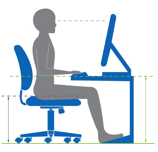 Remember that every body is unique and these ranges may need to be adjusted based on your workstation set up.  The general rule of thumb used to calculate the optimal seat height range is to subtract 10” from the work surface height.  This should be the mid-point of the chair’s seat height range.  Your seat height range should adjust at least 2.5” above and 2.5” below this mid-point.